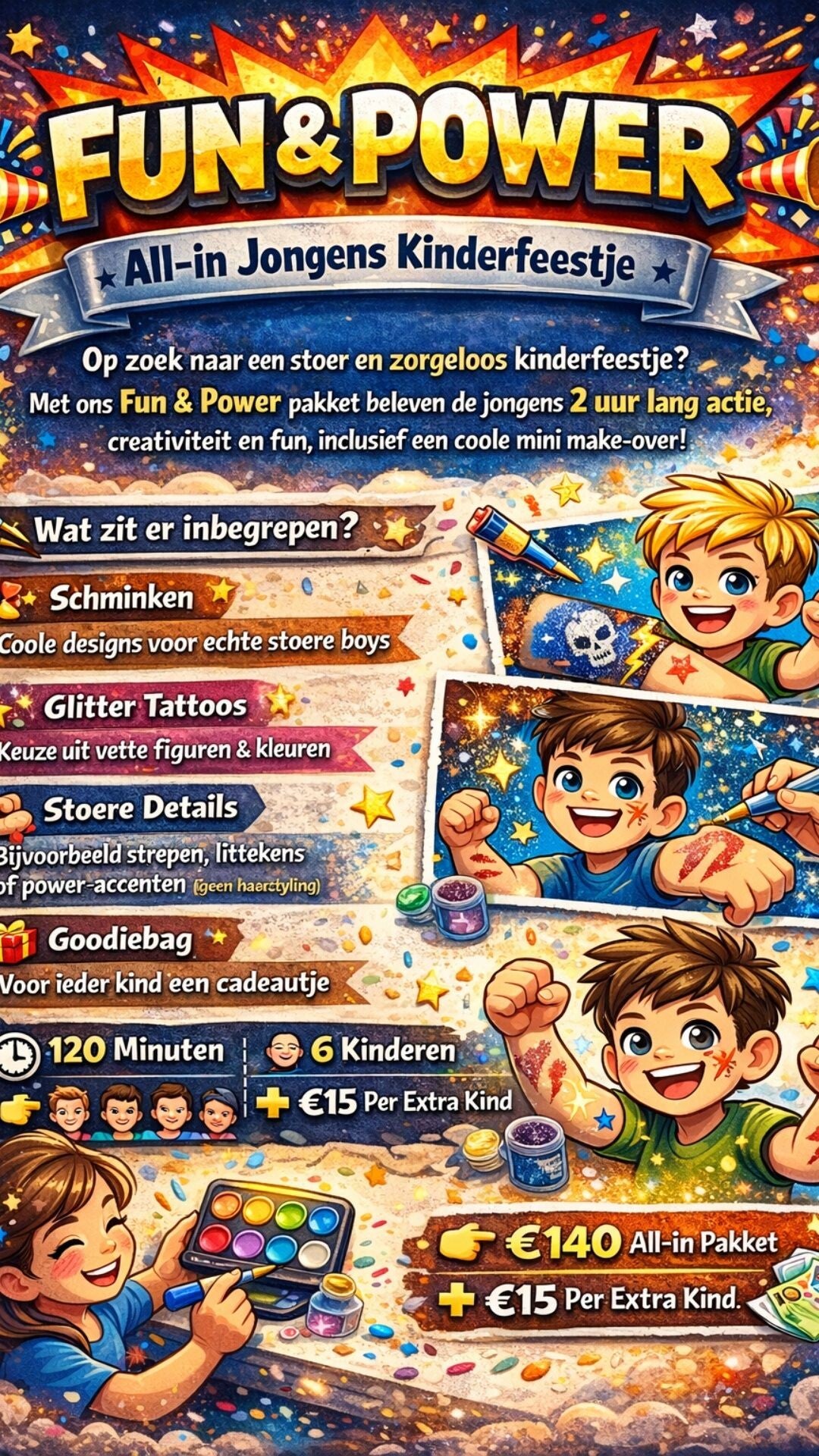 Met ons Fun & Power pakket beleven de jongens 2 uur lang actie, creativiteit en fun, inclusief een coole mini make-over!