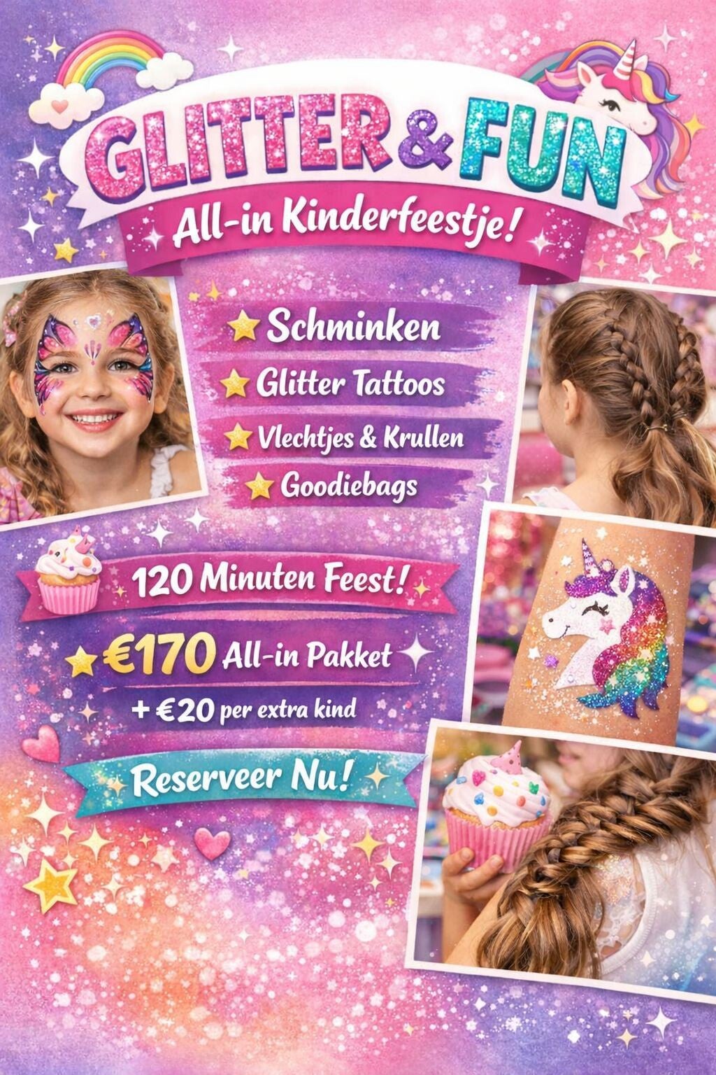 Ben je op zoek naar een geweldige manier om de verjaardag van jouw kind onvergetelijk te maken? Onze leuke kinderfeestjes pakketten bieden alles wat je nodig hebt voor een feestelijke dag vol plezier en creativiteit! Met ons aanbod van schminken, haarstylings en glittertatoeages kunnen de kinderen zich helemaal uitleven. Of het nu gaat om een prinsesje, een tijger of een stoere superheld, wij zorgen ervoor dat ieder kind zich kan transformeren in hun favoriete karakter. Onze ervaren teamleden staan klaar om de kinderen te schminken en hun haar te stylen, zodat ze er geweldig uitzien tijdens het feest. Daarnaast bieden we een ruime selectie van glittertatoeages die niet alleen mooi zijn, maar ook veilig en makkelijk aan te brengen. Kies voor een compleet pakket zodat je zorgeloos kunt genieten terwijl wij zorgen voor het entertainment. Maak van het verjaardagsfeestje een waar feest dat nog lang in het geheugen van de kinderen zal blijven hangen!